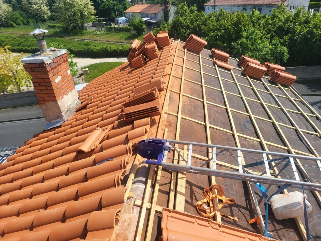 Nous réalisons tous les travaux de couverture sur toiture neuve ou en rénovation : pose de tuiles (terre cuite, béton, mécaniques), ardoises, bac acier, shingle, mais aussi rénovation complète, remplacement partiel, isolation de toiture par l’extérieur (sarking), démoussage et traitement hydrofuge.